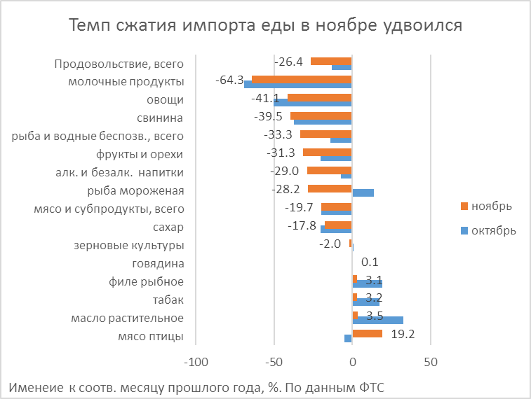 Особенно сильно – на 26.4% в годовом сопоставлении - упал импорт продовольствия. Падение ускорилось вдвое против октября (-13.3%) и вчетверо – против августа-сентября, когда он сокращался под влиянием продуктовых санкций. Наиболее критично сжатие по плодоовощной, рыбной и молочной продукции, где поставки снизились от трети до 2/3. Обеднение розничных прилавков в результате этого, хоть еще и не проявилось в полной мере, уже произвело переориентацию в пропагандистских усилиях: с внешнего врага, злоумышления которого клеймят теперь чуть реже, на внутреннего – спекулянта, который тоже вредит теперь уже не столько, скупая себе столь нужные нашей маленькой, но гордой экономике американские деньги, сколько в деле ценообразования на еду и отказывающийся дешеветь вслед за нефтью бензин. Хотя и не нужно быть кандидатом каких-либо наук, чтобы понять, что изъятие с рынка более четверти импортной пищи, при том, что она составляла там более трети, а по наиболее «просевшим» позициям - гораздо больше, никак не может оставить цены безучастными.