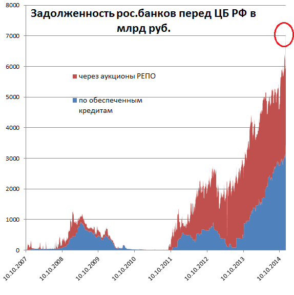 За последние пару дней произошел пугающий рост задолженности российских банков перед ЦБ. По основным каналам фондирования (через аукционы РЕПО и по обеспеченным кредитам) рост долга составил 1.2 трлн. руб с 10 по 12 декабря. Это рекордный прирост за столь короткий период времени. Последний раз нечто похожее было в 20-х числах октября, но там около 800 млрд.