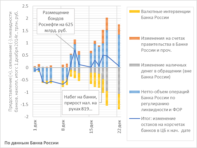 Попытаемся без особых комментариев реконструировать событийную канву так, как она видна из публикуемой ЦБ статистики (последние данные по движению ликвидности и интервенциям на валютном рынке доступны пока по состоянию на начало недели, 22 дек.); это лишь один из возможных сценариев, а как оно было на самом деле, возможно, расскажут когда-нибудь непосредственные участники событий.