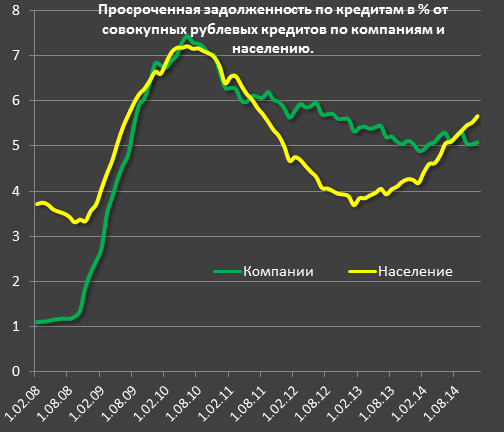 Стабильность в основном за счет высокой кредитоспособности компаний, а у населения просрочки растут с января 2013 (с заметным ускорением с апреля 2014).