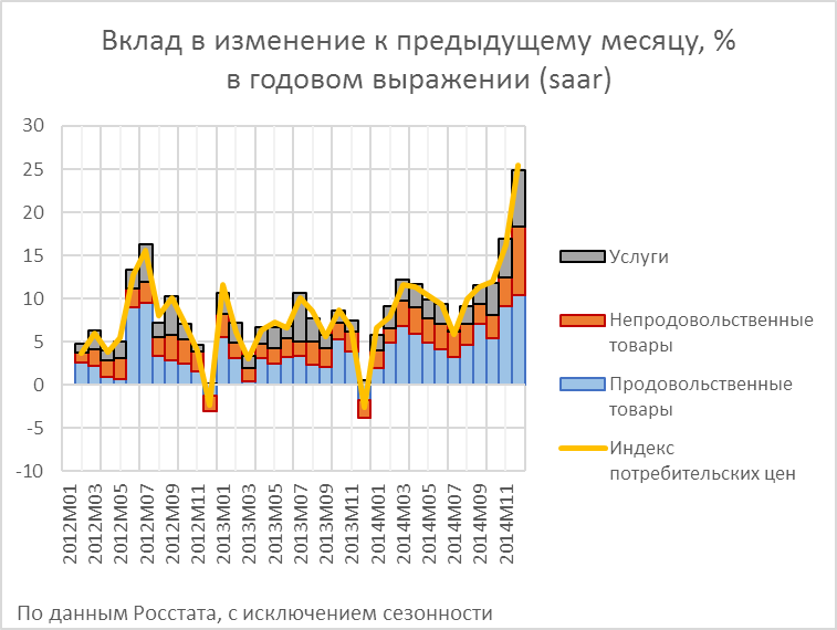 Но бог с ними, даже и без этого сезонно скорректированный показатель декабрьской инфляции к предыдущему месяцу (в годовом выражении), по-видимому, превысил 25%/год, удвоившись в сравнении со средними показателями осени. Вклад продовольствия в инфляцию остался наибольшим, но плюс к этому вдвое, в сравнении с ноябрем, вырос вклад непродовольственных товаров, и в 1.5 раза – вклад услуг (см. график).