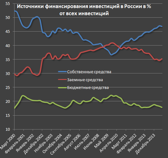 1. Собственные средства компаний: примерно 47% от всех инвестиций финансируется за счет собственных средств (естественно преимуществом за счет прибыли). Минимум был в начале 2010 на уровне 37%, с этого момента доля собственных средств увеличивается.