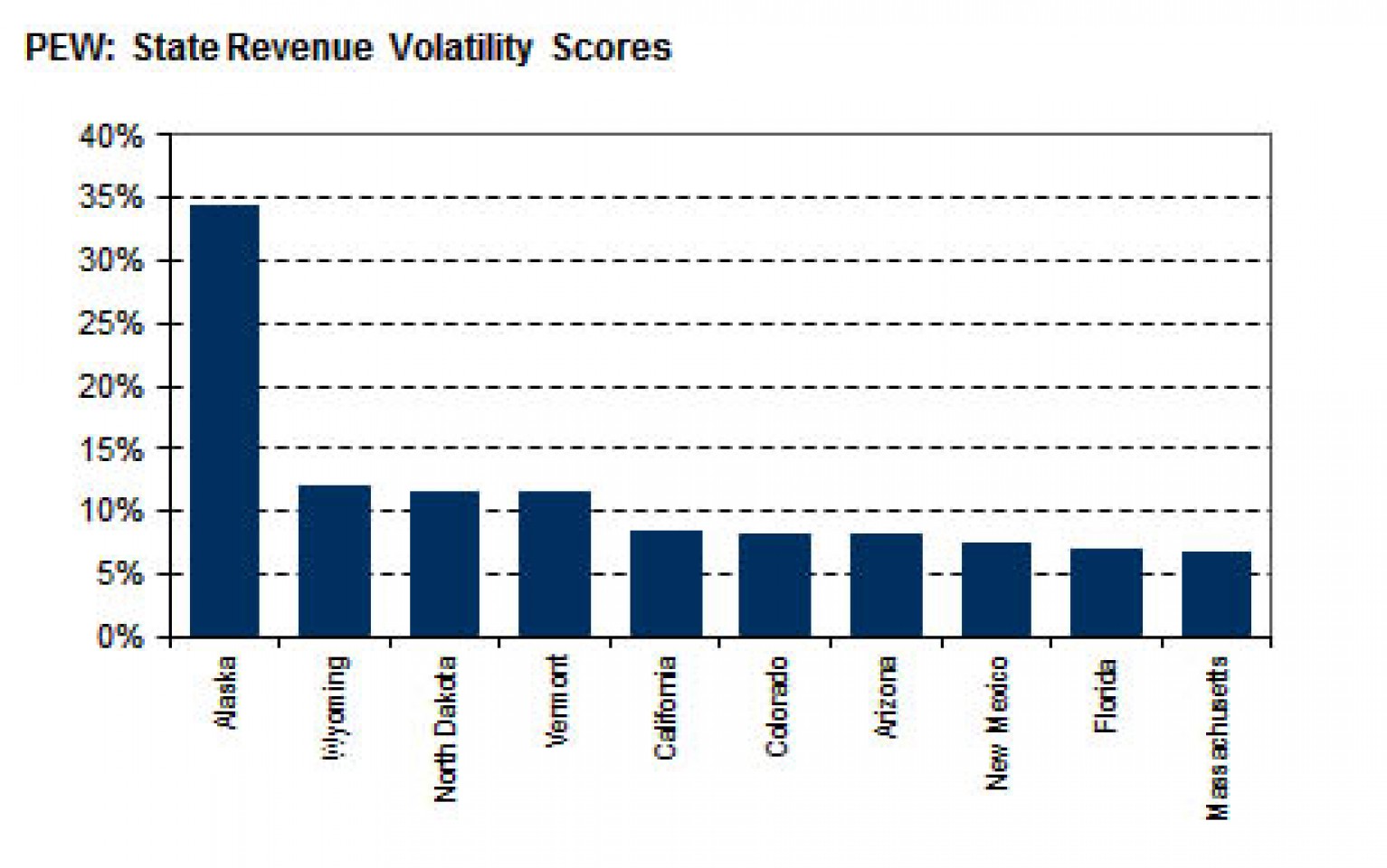 Оказывается, это совсем не так, по крайнем мере об этом свидетельствуют последние данные из доклада Pew, пишет Zerohedge. Отчет Pew дает оценку волатильности налоговых поступлений по отдельным штатам, основанной на изменении доходов отдельных штатов в годовом выражении.