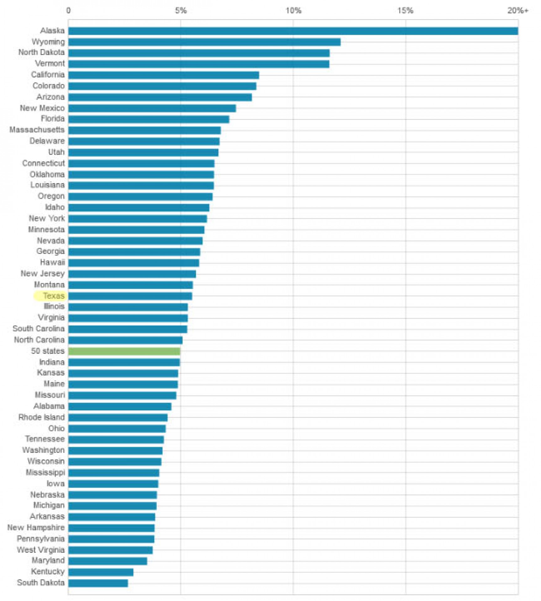 Техас, как ни странно, находится аккурат в середине таблицы. Да, действительно, Техас может столкнуться с рецессией из-за падения цен на нефть, поскольку энергетическая отрасль - самый большой для него источник доходов. Но если взглянуть на волатильность налоговых поступлений в других штатах, доходы которых также опираются на налоговые поступления от добычи нефти, то становится ясно, что в США есть примерно еще 25 штатов, которые могут пострадать гораздо сильнее, чем сам Техас.