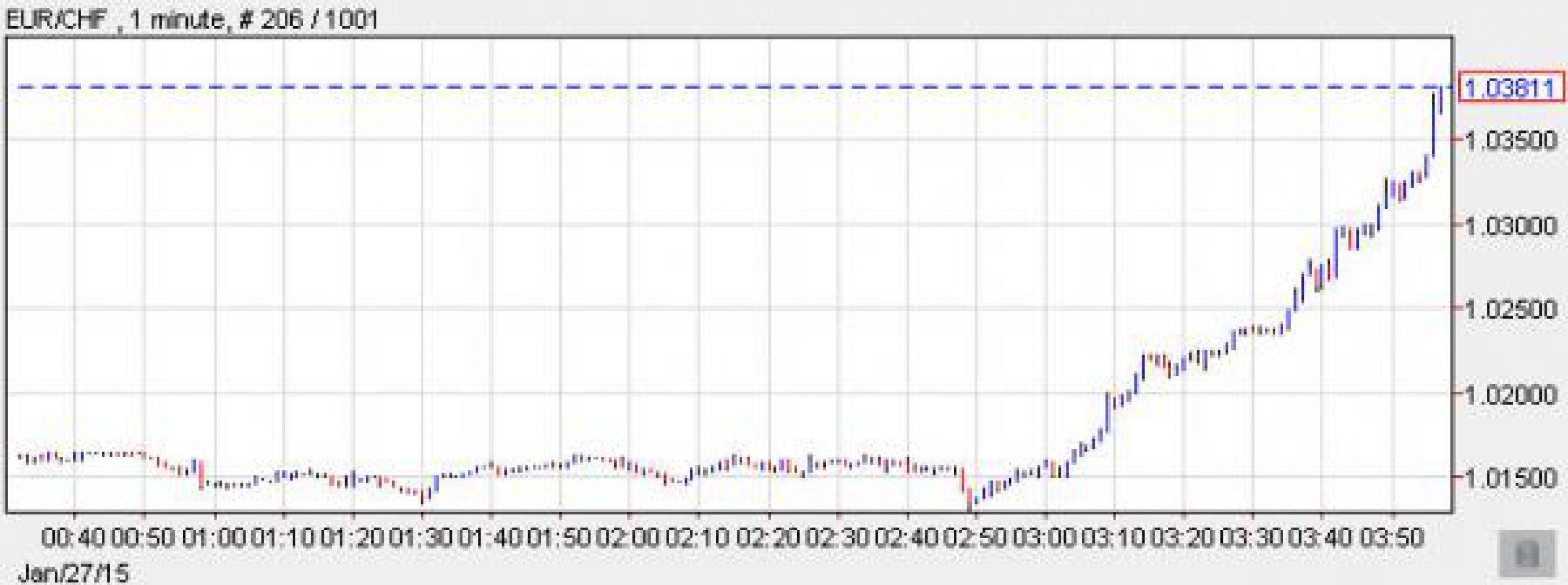 И в самом деле, ликвидность в EUR/CHF была невелика. Больше похоже на какую-то спекуляцию. Достаточно было немного сдвинуть котировки, и тысячи стоп-лоссов вызвали лавину обратного движения. А вот что было дальше: