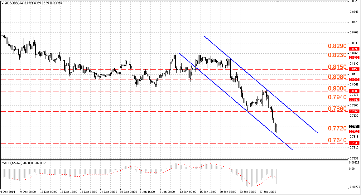 Австралийская валюта потеряла в цене и опустилась до трёхдневной минимальной отметки 0.7720 пунктов в паре с американским долларом с ранее установленного максимума на отметке 0.8000.