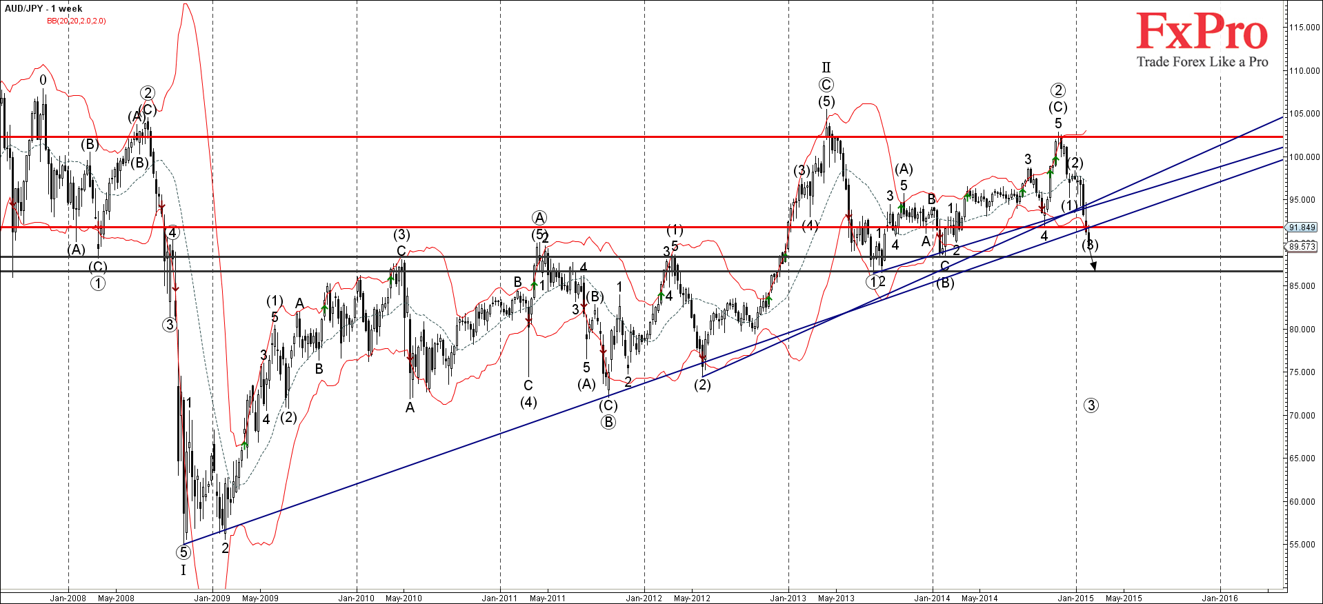 AUD/JPY продолжает сильно падать после недавнего прорывал уровня поддержки 91.80 (который развернул предыдущую краткосрочную коррекцию 4 в октябре 2014 г.) – который пересекается с долгосрочной недельной линией поддержки от октября 2008 года. Прорыву этой поддержки предшествовал прорыв кластера трендовых линий, состоящий из 2 пересекающихся линий поддержки от августа 2013 и от мая 2012 года.