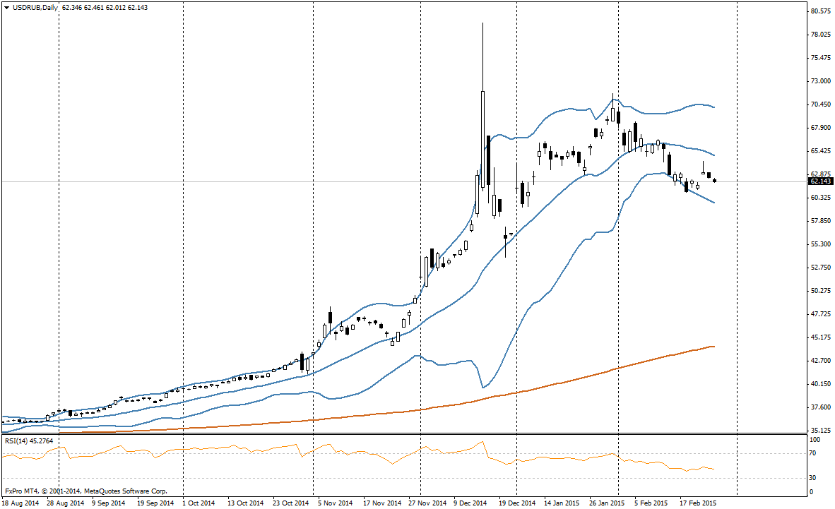 У рубля сохраняется потенциал укрепления к доллару и снижения пары USDRUB ниже 60. Эта тенденция поддерживается остановкой ралли доллара. В США сейчас выходят не слишком сильные макроэкономические данные, что заставляет рынки отдалять прогнозную дату первого повышения ставок ФРС с середины года на 3-4 квартал 2015 года.