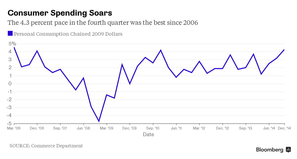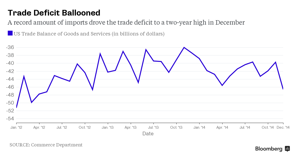 Этот уровень роста потребительских расходов был лучшим с первого квартала 2006 года, и вероятно, был связан с сильными данными по росту занятости в прошлом году. Если потребление останется в силе, как прогнозировали экономисты, это будет создавать существенный попутный ветер в 2015 году. "Внутренняя экономика казалась весьма сильной в конце 2014 года, и я думаю, что импульс сохранится в первом квартале нового года", - заявил Майкл Гирард, главный американский экономист RBS Securities Inc. в Нью-Йорке. "В частности в потребительском секторе все вполне неплохо". Снижение дефицита торгового баланса, вероятно, будет весьма сложной задачей в краткосрочной перспективе, так как слабость на зарубежных рынках означает снижение спроса на американские товары, тогда как растущий доллар лишь делает американский экспорт дороже, а закупки за границей дешевле. Тем временем, экономисты также ожидают, что запасы внесли меньший вклад в рост, чем ранее ожидалось. Хотя запасы росли в большей степени в четвертом квартале по сравнению с прошлыми тремя месяцами, пересмотренные данные, вероятно, покажут, что рост не соответствовал первоначальным оценкам правительства. Это создает более прочную основу для роста США в первом квартале.