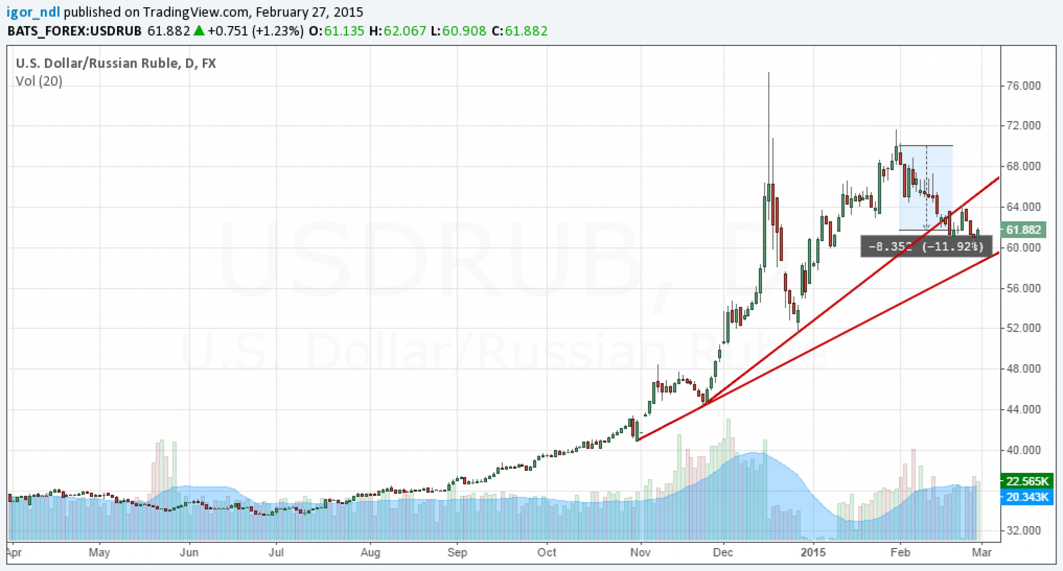 Поддержку рублю оказывают растущие цены на нефть и действия монетарных властей, которые постепенно сокращают рублевую ликвидность. Итак, за февраль рубль вырос к доллару примерно на 12%.