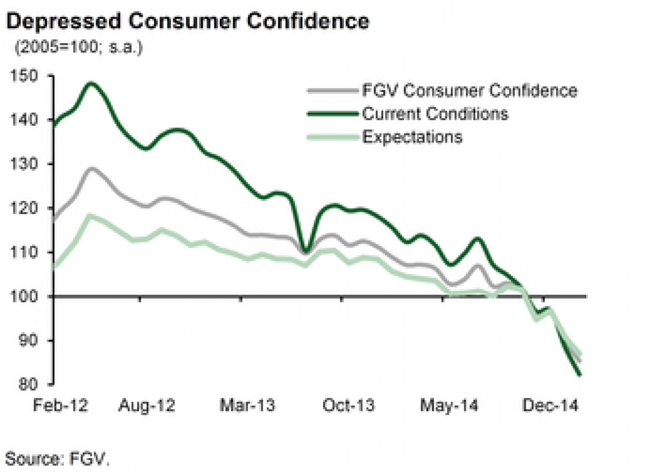 продолжает свое падение с июня 2011 г., и очередные минимумы уже никого не удивляют. Состояние экономики страны оставляет желать лучшего, о чем свидетельствуют хотя бы вышедшие на днях данные по потребительскому доверию - абсолютный исторический минимум. Забегая вперед, нельзя не отметить, что у Бразилии, России и Китая картинка с потребительским доверием буквально сделана под копирку. Логично, что и падение всех этих валюты выглядит закономерным. Вот так это выглядит в России: