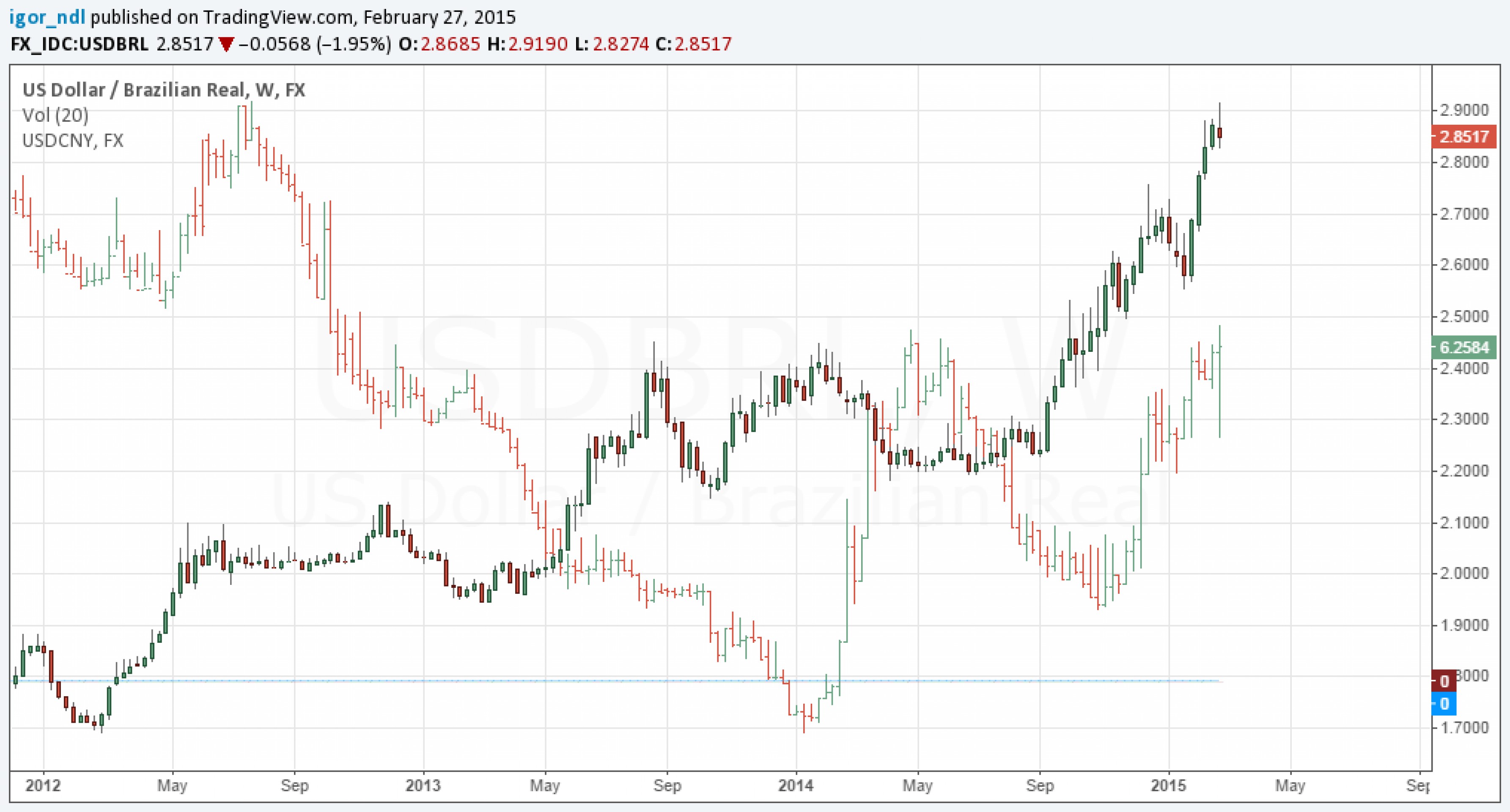 Ниже приведем график валютных пар доллар/реал и доллар/юань.