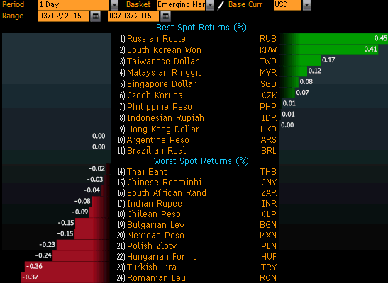 С 3 февраля по 3 марта рубль укрепился к доллару на 0,45% (этом курс доллара снизился практически на 10%). Аналогичную динамику продемонстрировала корейская вона, укрепившись к доллару на 0,41%.