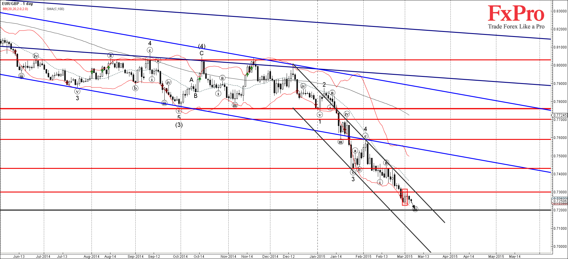 Прорыв уровня поддержки 0.7300 должен еще больше ускорить активную краткосрочную под-волну (iii), которая принадлежит 5-у краткосрочному импульсу 5 от начала февраля (который сам является частью долгосрочной импульсной волны (5) от октября 2014 года, как Вы можете видеть ниже).