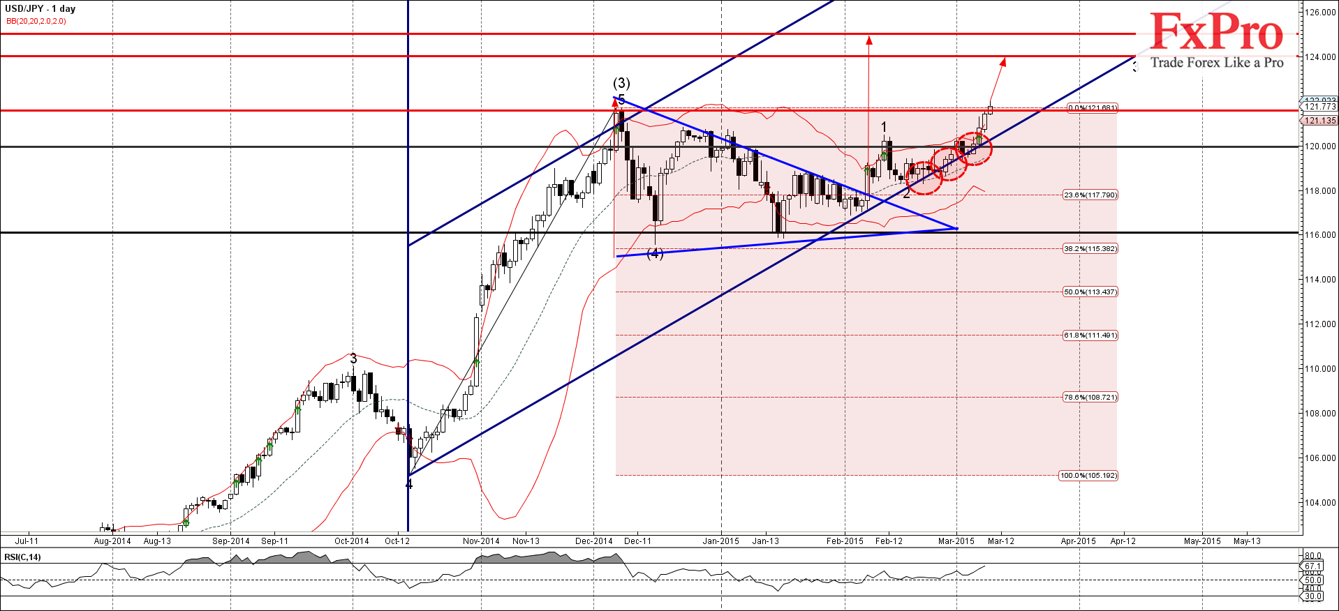Если пара закроется выше уровня сопротивления 121.60, тогда можно будет ожидать дальнейшего роста USD/JPY в активной краткосрочной импульсной волне 3 (которая принадлежит 5-у среднесрочному импульсу (5) от декабря) к следующим целям для покупок – 124.00 и 125.00 (прогнозируемая цена для восходящего ценового импульса, который прорвал предыдущий треугольник от декабря).