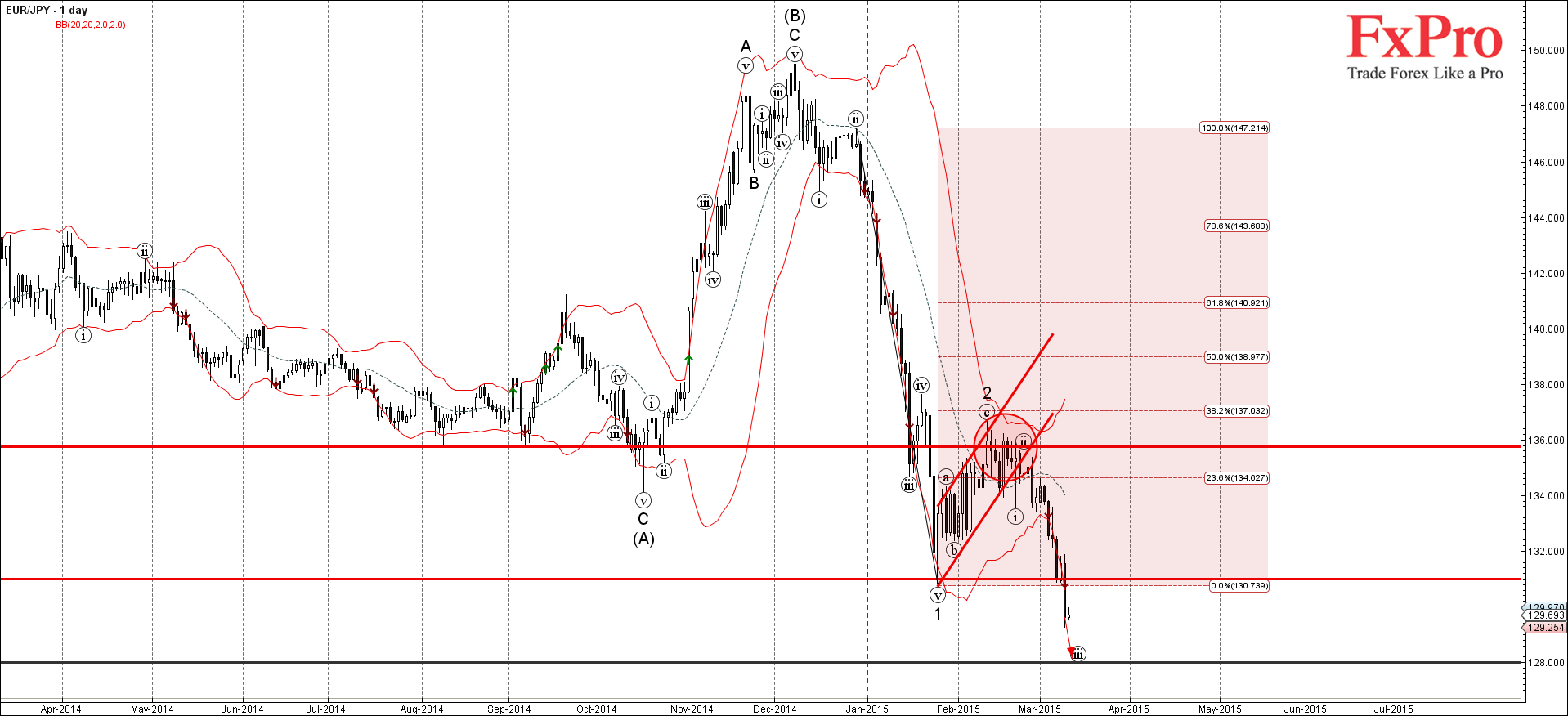 EUR/JPY вчера прорвала сильный уровень поддержки 131.00 (который ранее развернул предыдущую краткосрочную нисходящую импульсную волну 1 в январе, как Вы можете видеть на дневном графике EUR/JPY ниже). Прорыв этого уровня поддержки продолжает активную краткосрочную импульсную волну 3 -, которая началась в прошлом месяце - когда пара развернулась вниз от зоны сопротивления окружающей уровень сопротивления 135.80.