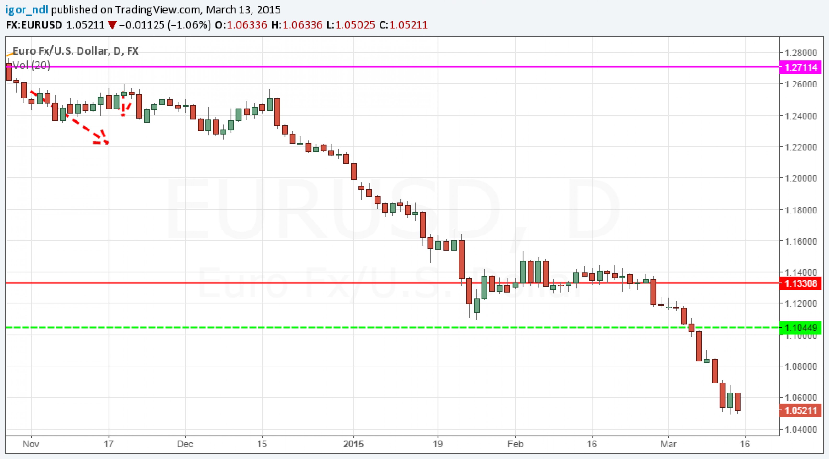 Итак, сегодня евро теряет к доллару около 1% и торгуется вблизи локальных минимумов, достигнутых накануне в азиатскую сессию. Кстати, единая европейская валюта за неделю потеряла к доллару чуть более 7%, что соответствует падению нефтяных цен. Таким образом, можно сделать вывод, что основной движущей силой падения нефтяных фьючерсов стал рост доллара.
