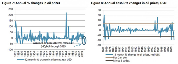 График ниже показывает годовое процентное изменение цен на нефть. Если цены оставались вблизи текущих уровней в течение оставшейся части 2015 года, это было бы необычным. По оценкам, за последние 150 лет были только восемь подобных случая. Например, при совокупном изменении цены на нефть за два года более чем на 50% дало бы сейчас цену на «черное золото» вблизи отметки $60 за баррель. И существует вероятность в 25%, что цены на нефть поднимутся до $80 или выше к концу 2015 на основании статистических данных о колебании цен на нефть в прошлом и того, как идут графики.