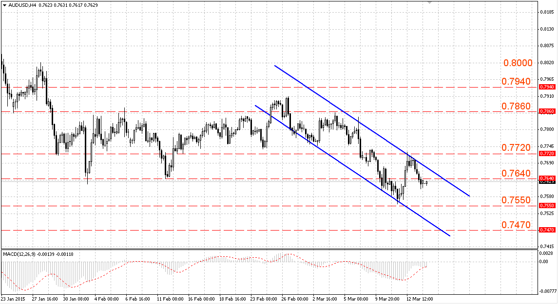 Пара AUD/USD торгуется в нисходящем канале 0.7675-0.7550. Значимые уровни Фибоначчи для коррекции 23.6 (0.7640), 38.2 (0.7690), 50.0 (0.7730).