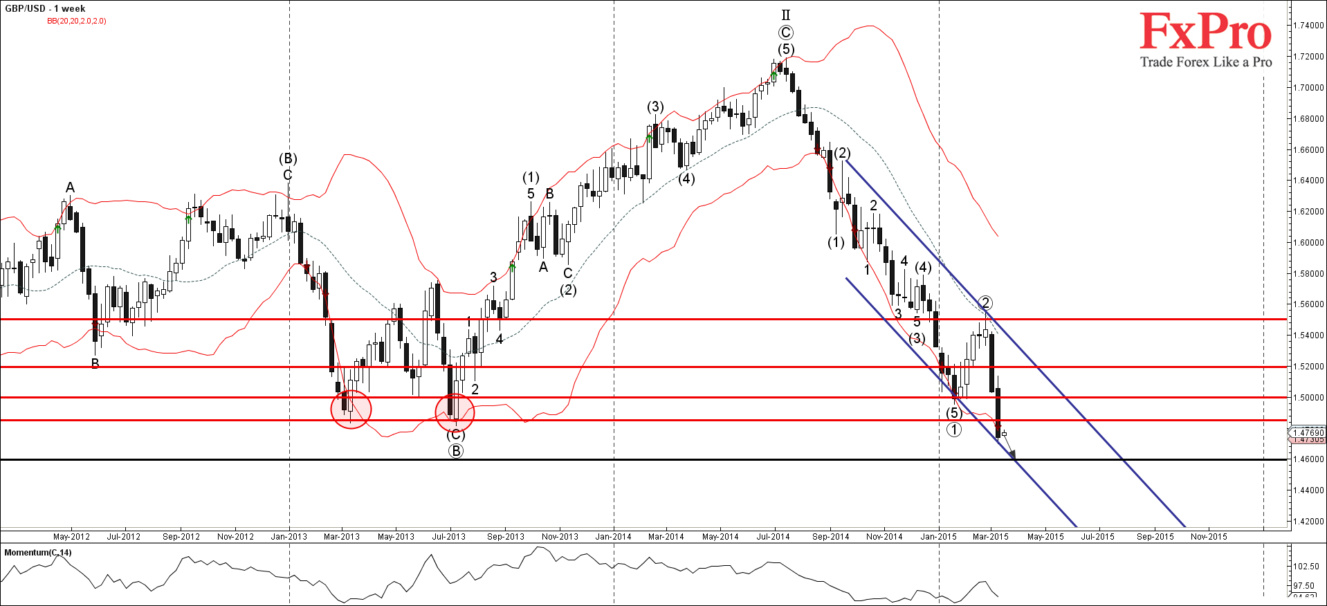 Прорыв уровня поддержки 1.5200 ускорил активную краткосрочную импульсную волну 1 долгосрочного недельного нисходящего импульса ③ от февраля. Этот долгосрочный импульс далее прорвал следующий уровень поддержки 1.5000, и совсем недавно - сильный уровень поддержки 1.4850 (который ранее развернул 2 резкие недельные нисходящие импульсные волны в марте и в июле 2013 года, как Вы можете видеть на недельном графике GBP/USD ниже).