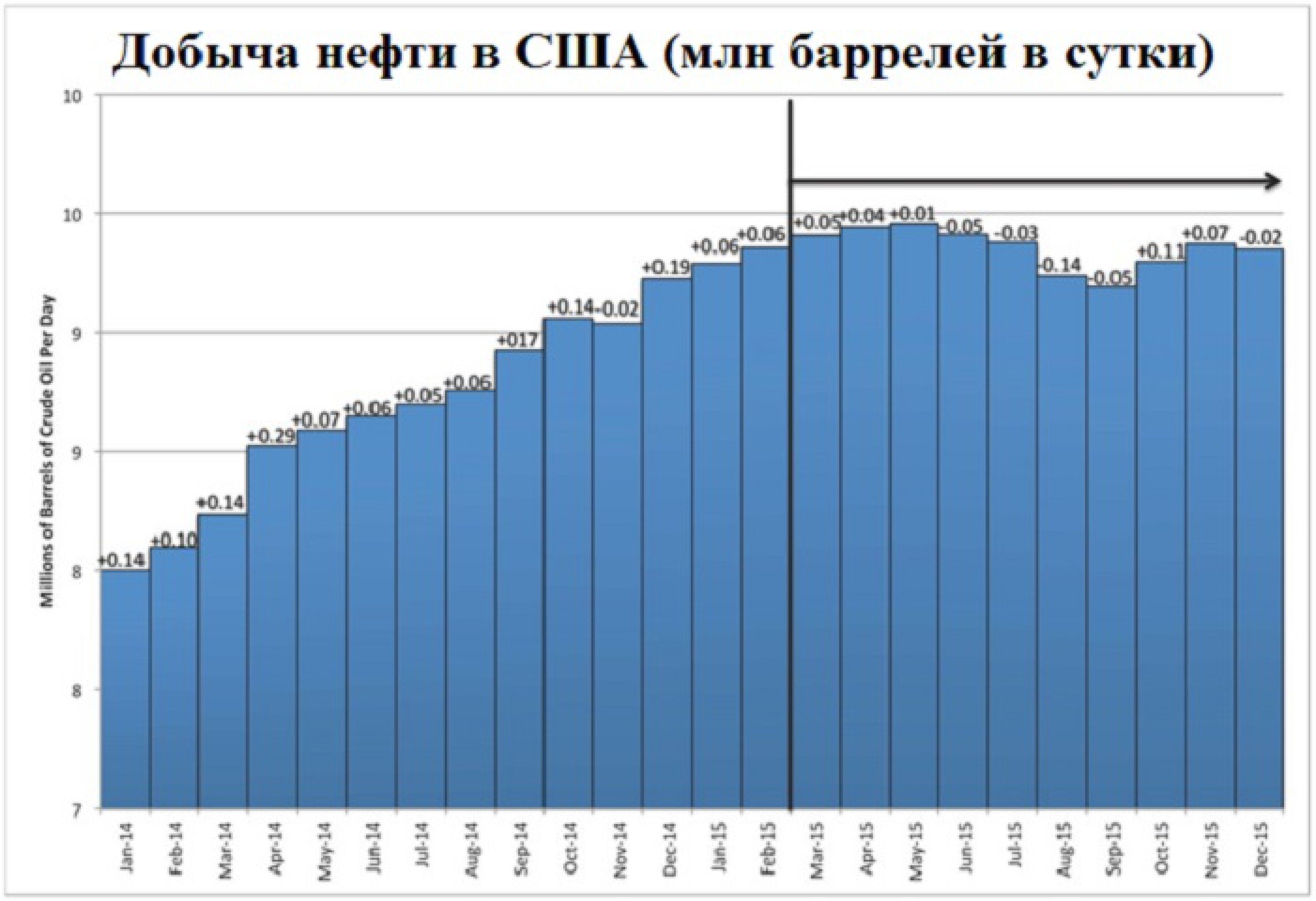 По последним данным EIA за февраль 2015 г., избыток мировых поставок сократился до 560 тыс. баррелей жидких углеводородов в сутки. Горизонтальные скважины на месторождениях Баккен, Eagle Ford и в Пермском бассейне производили около 3,5 млн баррелей нефти в ноябре 2014 г.