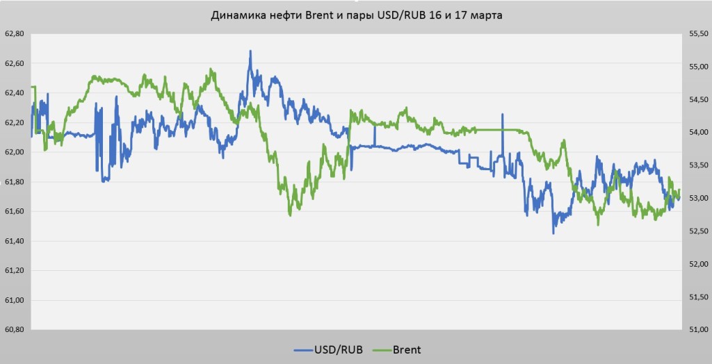 Особенно заметна ситуация стала 17 марта, когда рубль ощутимо укреплялся при сильном падении цен на нефть. К вечеру торгового дня доллар стоил 61,69 руб. (укрепился почти на 50 коп.) при цене на нефть на уровне $53,15 (-0,5%) за баррель. Более месяца назад, в начале февраля, нефть торговалась примерно на аналогичных уровнях, но тогда доллар находился в диапазоне 65-70 руб.