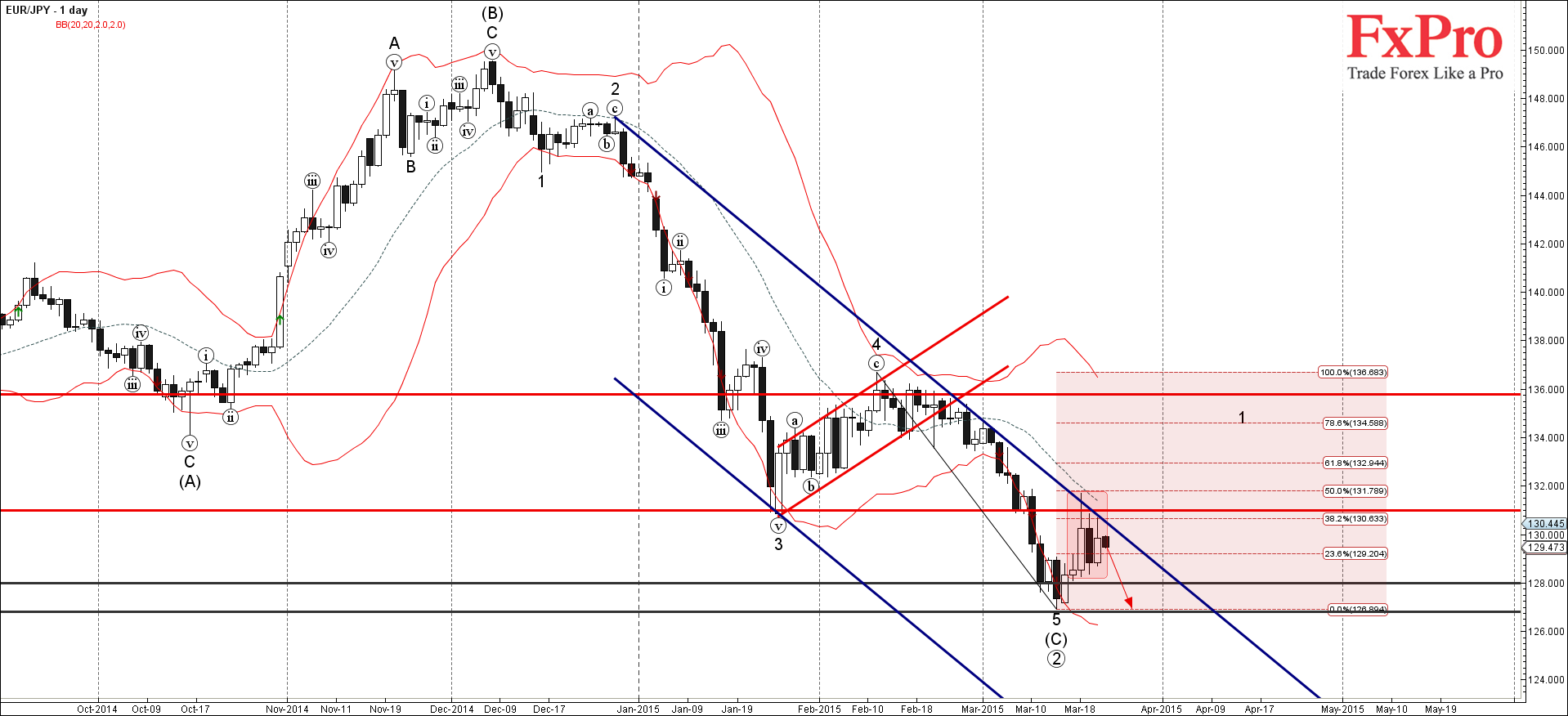 Восходящая коррекция от 128.00 развернулась вниз от зоны сопротивления, лежащей между уровнем сопротивления 131.000 (бывший сильный уровень поддержки, который развернул предыдущую краткосрочную импульсную волну 3 в январе), 50% коррекцией Фибоначчи предыдущего краткосрочного импульса 5 и линией сопротивления дневного нисходящего канала от декабря.