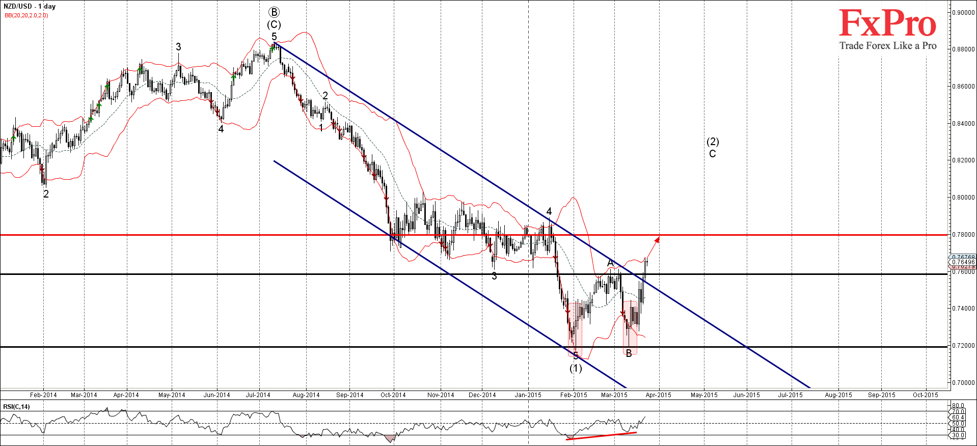 NZD/USD, скорее всего, продолжит расти к следующей цели для покупок 0.7800. Стоп-лосс для покупок можно разместить ниже недавно-прорванного ценового уровня 0.7600.