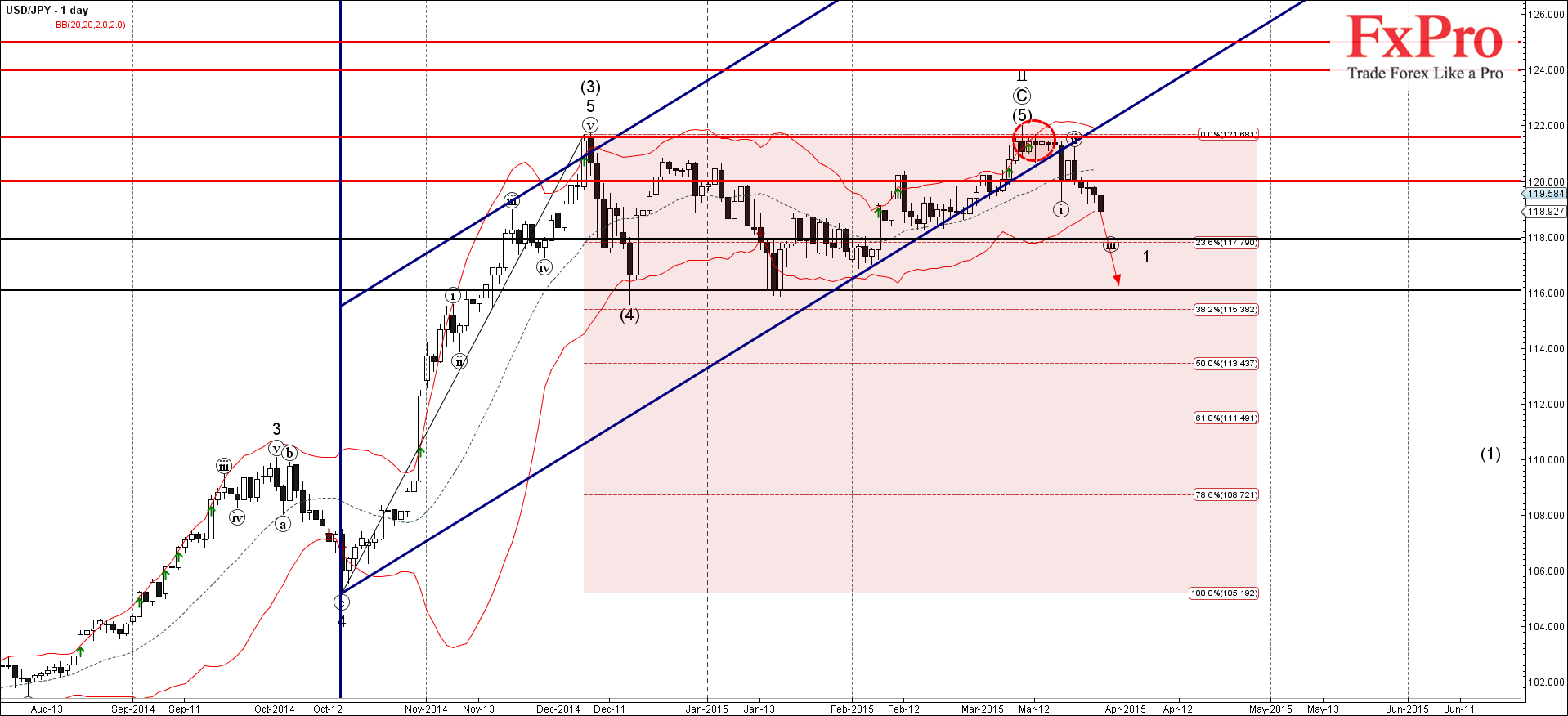 USD/JPY продолжает падение после недавнего нисходящего разворота от сильного уровня сопротивления 121.60 (бывший сильный уровень сопротивления, который развернул среднесрочный импульс (3) в декабре, как Вы можете видеть ниже). Пара сделала несколько безуспешных попыток прорвать этот уровень сопротивление - после чего она развернулась резко вниз (таким образом завершая предыдущую волну ②) - прорвав линию поддержки широкого дневного восходящего канала от октября прошлого года.