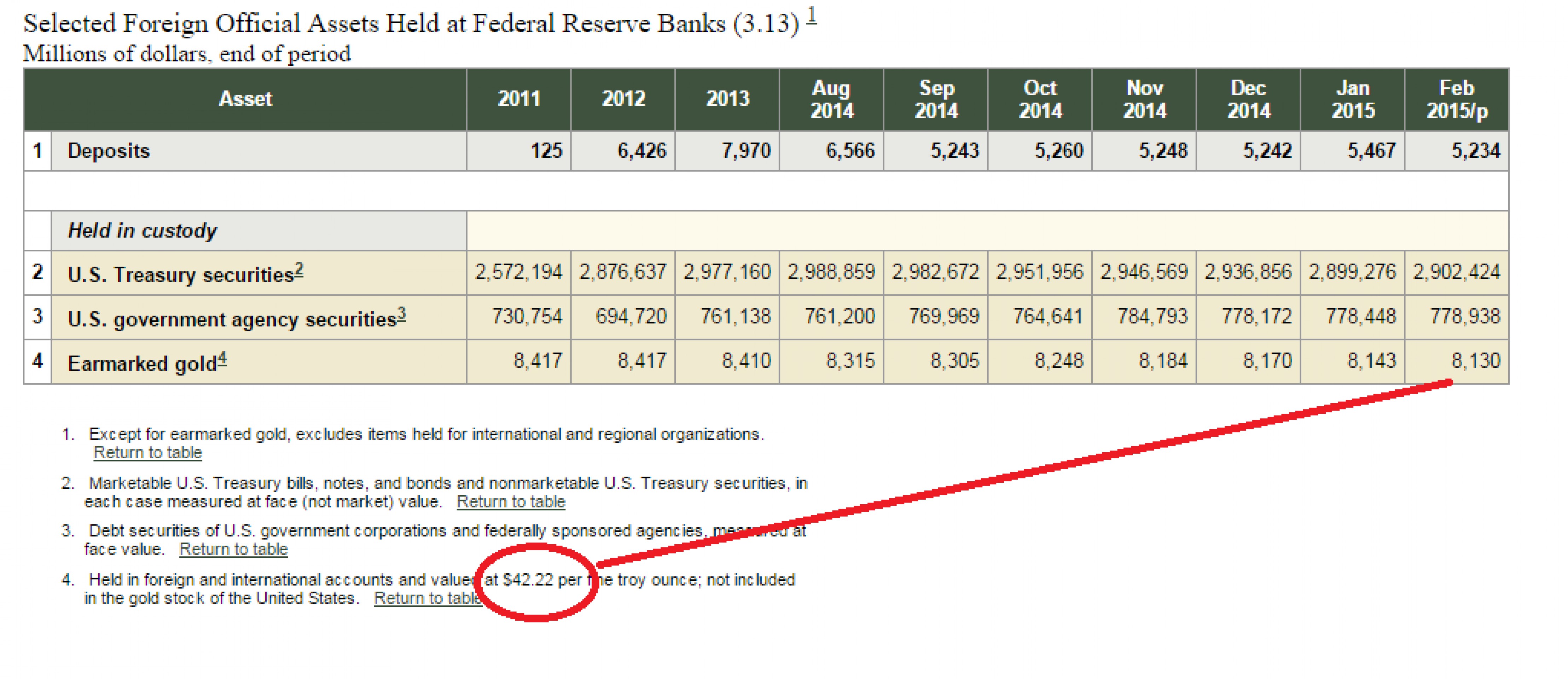 Всего Министерству финансов США принадлежит 8134 тонны золота. Оно было передано в казну ФРС в 1934 г. в обмен на золотые сертификаты, пишет goldena.ru. Сейчас эти сертификаты на балансе ФРС все еще оцениваются по $42,22 — это значение было установлено в 1973 г. Переоценка золота на балансе ФРС с тех пор не проводилась. Есть подозрение, что нежелание приводить цену золота на балансе к рыночной реальной цене - попытка отрицания истинного значения золота и маскировка слабости доллара, чтобы поддержать его господство. Любопытно отметить, что ФРС не только свое золото оценивает по $42,22, но также и золото других государств. Возможно, это сделано для простоты учета, однако такой подход укладывается в теорию господства американской валюты.