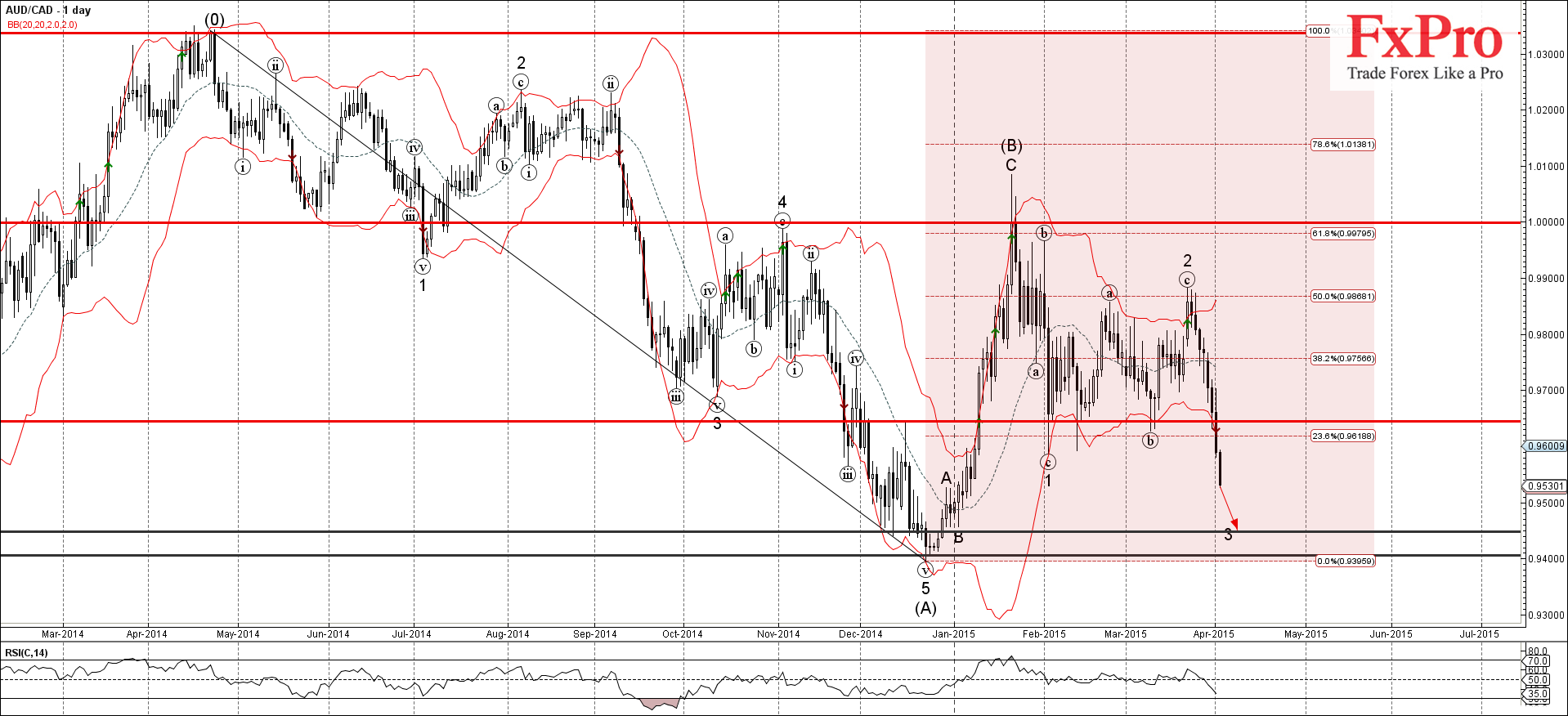 AUD/CAD продолжает падение внутри среднесрочной (C)-волны - которая началась в середине января - когда пара резко развернулась от зоны сопротивления лежащей между паритетом и 61.8% коррекцией Фибоначчи предыдущего нисходящего импульса от апреля 2014 года. Краткосрочная импульсная волна 3 активной (C)-волны вчера прорвала сильный уровень поддержки 0.9600 (который развернул предыдущие волны 1 и (b)).