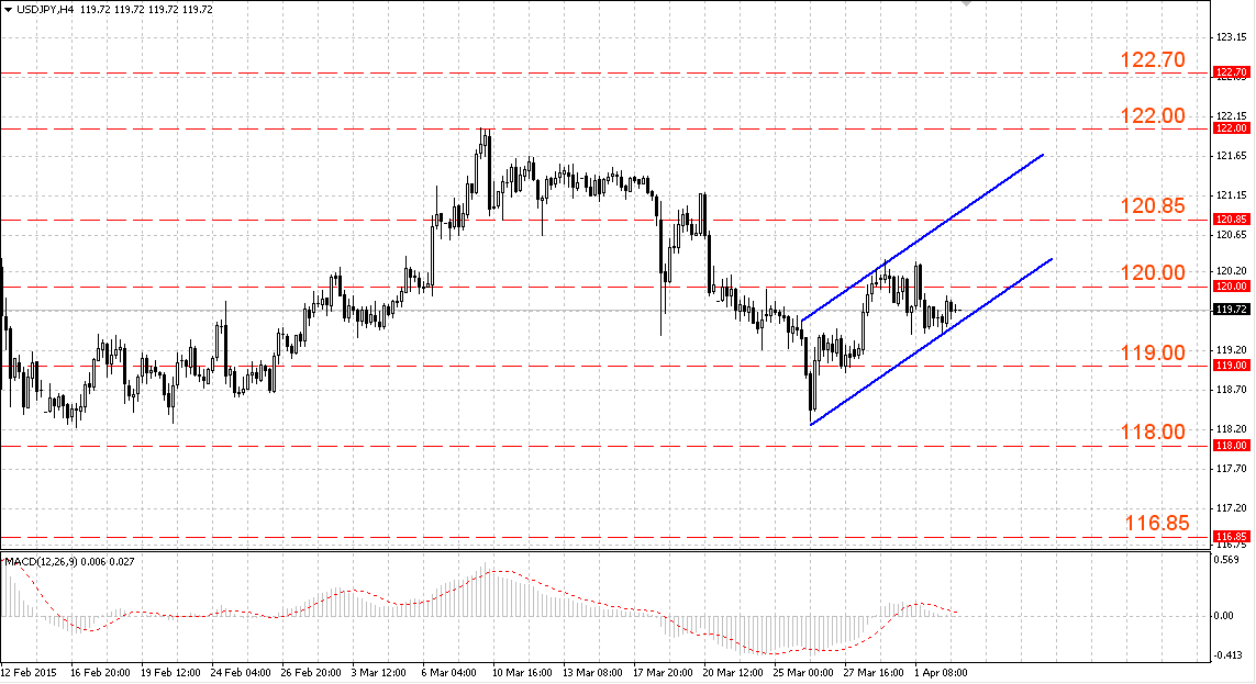 Пара USD/JPY торгуется в восходящем канале 119.50-120.35. Значимые уровни Фибоначчи для коррекции 23.6 (119.90), 38.2 (119.60), 50.0 (119.40).