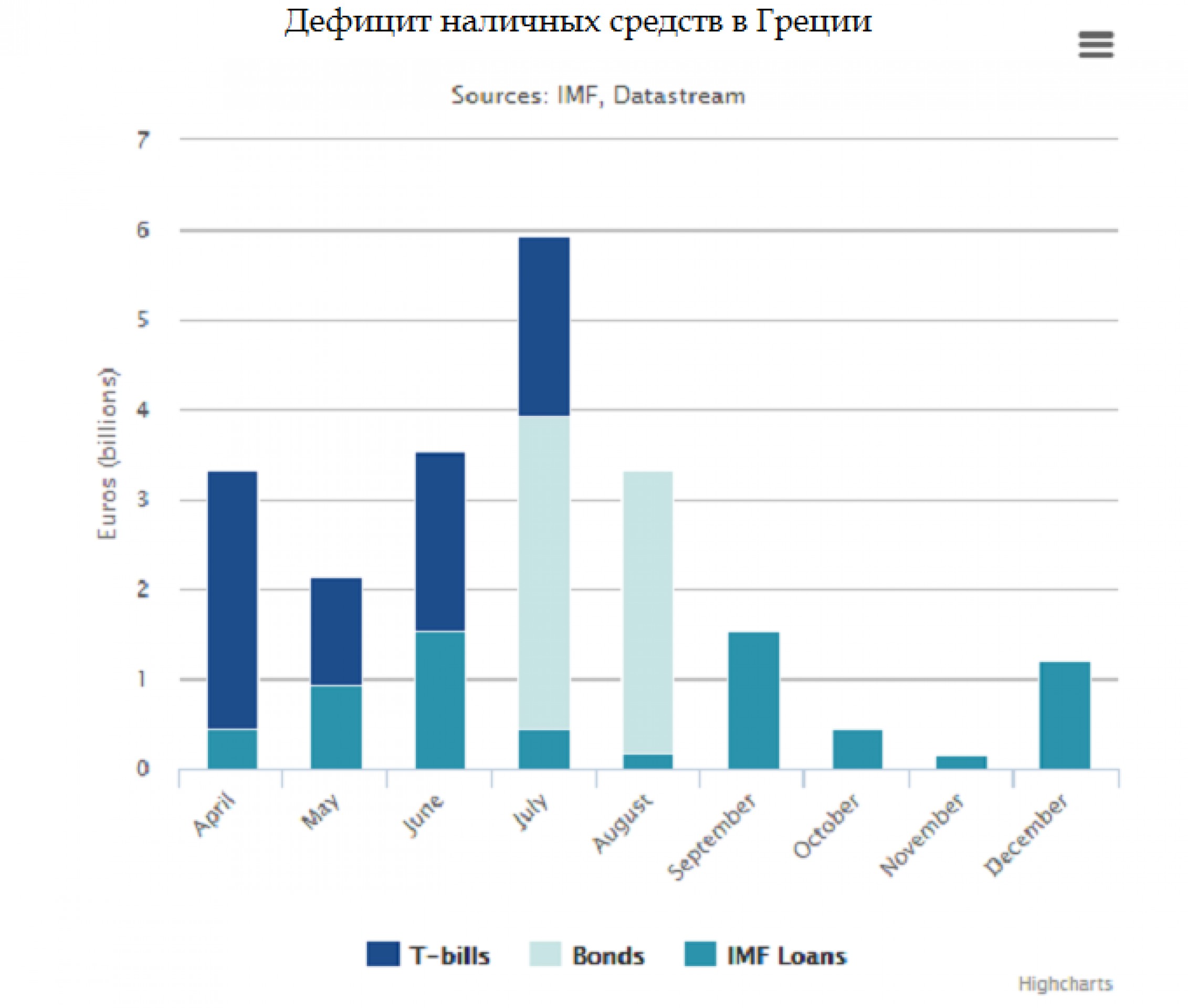 И хотя власти не хотят официально объявлять дефолт МВФ, министр внутренних дел Греции Никос Вуцис заявил следующее: "Мы с августа не получили ни одного евро. В мире нет ни одной страны, которая может погасить свои долговые обязательства за счет собственных ресурсов, не привлекая кредитов.