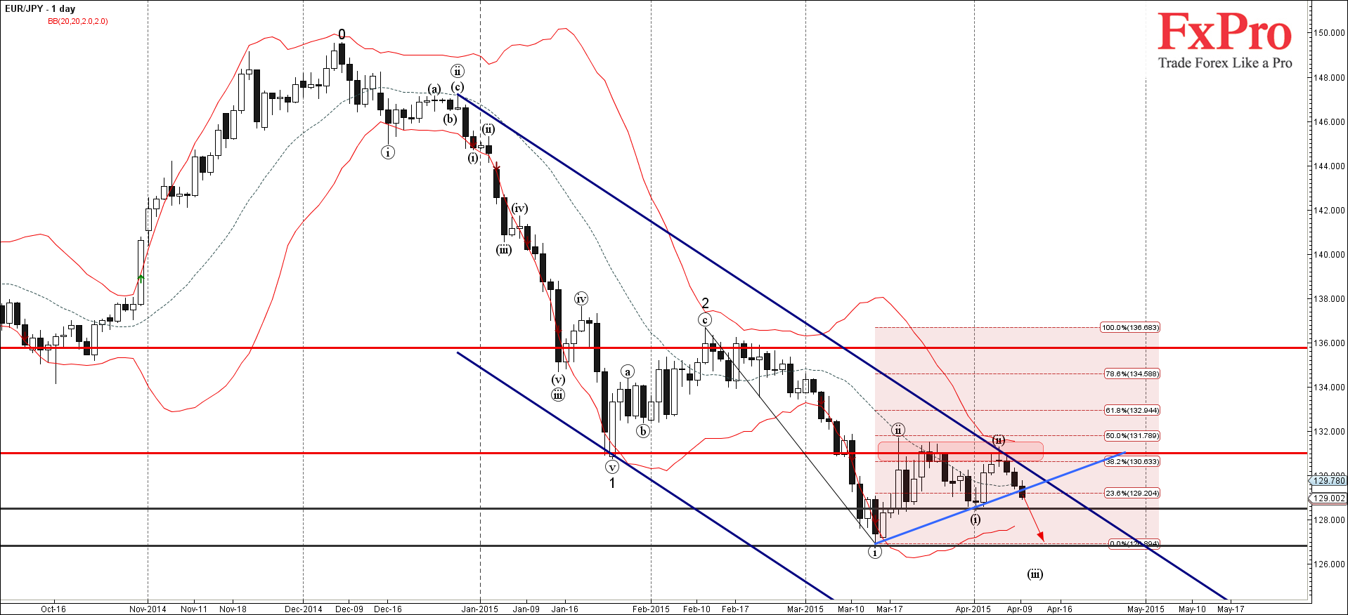 EUR/JPY продолжает падение после недавнего нисходящего разворота от сильного уровня сопротивления 131.00 (бывший сильный уровень поддержки, который остановил предыдущую краткосрочную импульсную волну 1 в январе, как Вы можете видеть ниже). Зона сопротивления возле уровня 131.00 была усилена 38.2% коррекцией Фибоначчи предыдущего нисходящего импульса (i) от февраля.