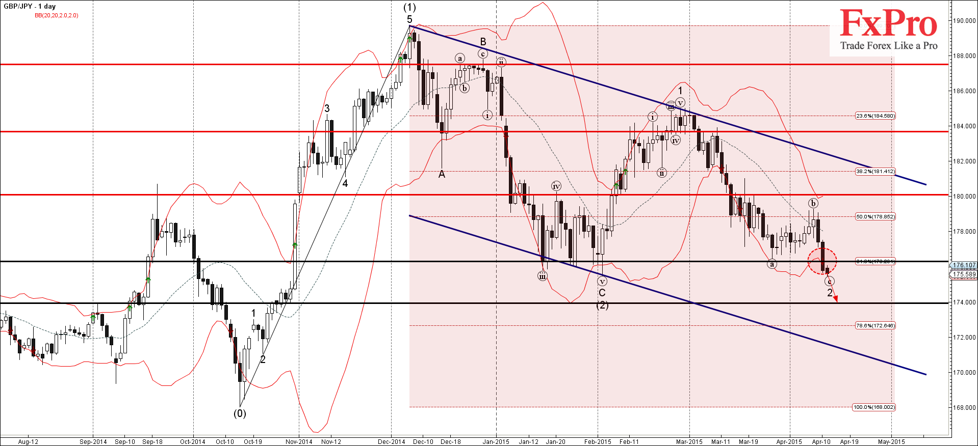 GBP/JPY недавно прорвал сильный уровень поддержки 176.30 (который несколько раз развернул пару с середины января, как Вы можете видеть ниже). Прорыв этого уровня поддержки совпал с прорывом 61.8% коррекции Фибоначчи предыдущей резкой среднесрочной импульсной волны (1) от октября прошлого года.
