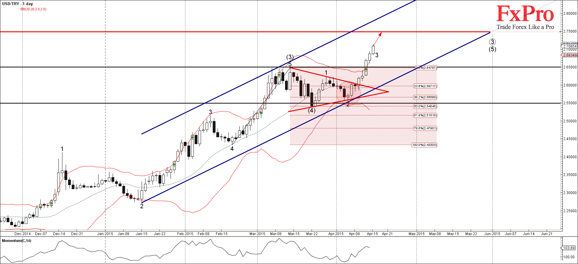 USD/TRY продолжает расти после недавнего прорыва сильного уровня сопротивления 2.6500 (который развернул предыдущую среднесрочную импульсную волну (3) в марте, Вы можете видеть ниже). Прорыв этого уровня сопротивления продолжает активную краткосрочную импульсную волну 3 - которая ранее прорвала дневной треугольник от прошлого месяца.