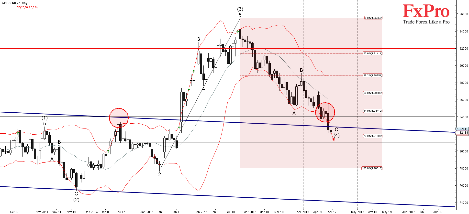 GBP/CAD продолжает падение после недавнего прорыва сильной зоны поддержки лежащей между уровнем поддержки 1.8400 (бывший сильный уровень сопротивления, который развернул предыдущую краткосрочную импульсную волну 1 в середине декабря) и 61.8% коррекцией Фибоначчи предыдущего восходящего импульса от января (как Вы можете видеть на дневном графике GBP/CAD ниже).