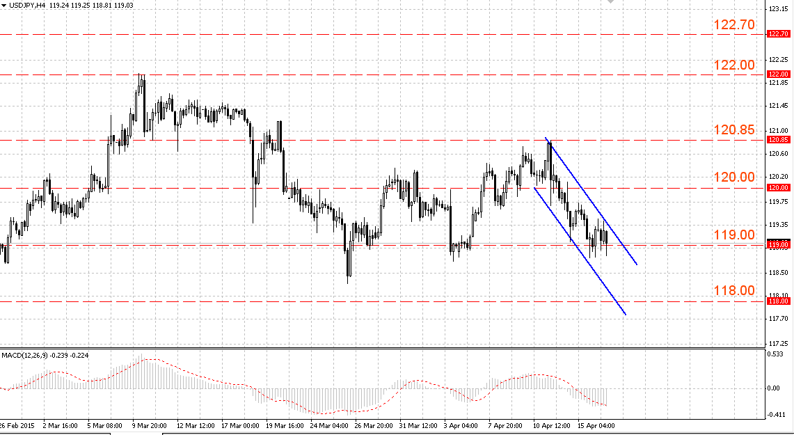 Пара USD/JPY торгуется в нисходящем канале 119.40-118.80. Значимые уровни Фибоначчи для коррекции 23.6 (119.25), 38.2 (119.55), 50.0 (119.80).