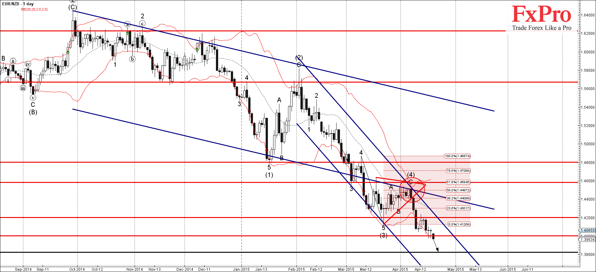Учитывая, что пара только что прорвала круглый уровень поддержки 1.4000, ожидается, что EUR/NZD продолжит падение внутри активной импульсной волны (5) к следующей цели для продажи на уровне 1.3800. Стоп-лосс для продажи можно разместить над уровнем 1.4200.