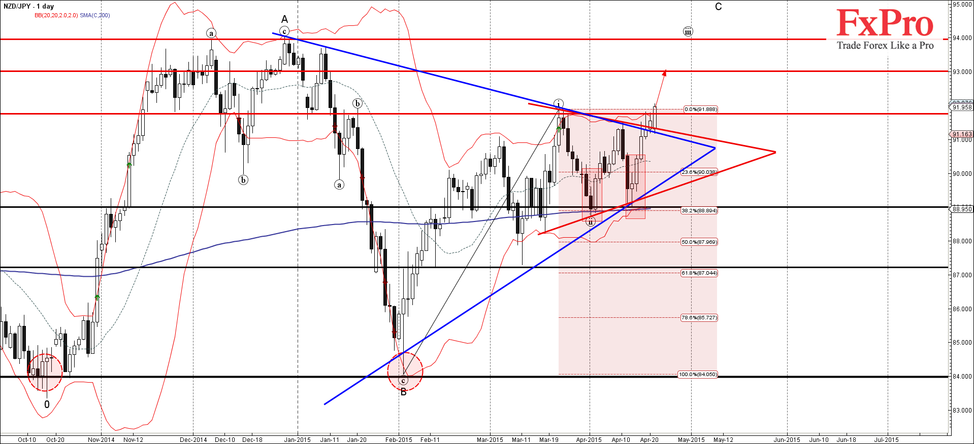 Если NZD/JPY сегодня закроется выше уровня сопротивления 91.90, тогда можно будет ожидать дальнейшего роста пары внутри активной C-волны от февраля - к следующей цели для покупок 93.00.