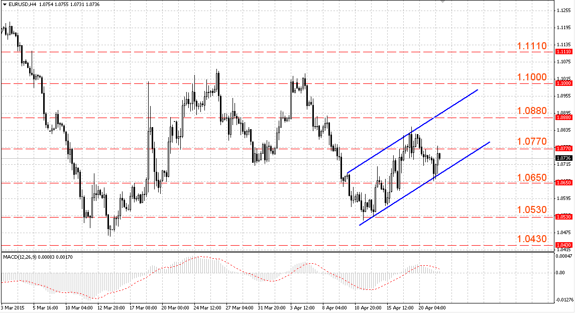 Пара EUR/USD торгуется в восходящем канале 1.0680-1.0810. Значимые уровни Фибоначчи для коррекции 23.6 (1.0770), 38.2 (1.0720), 50.0 (1.0685).