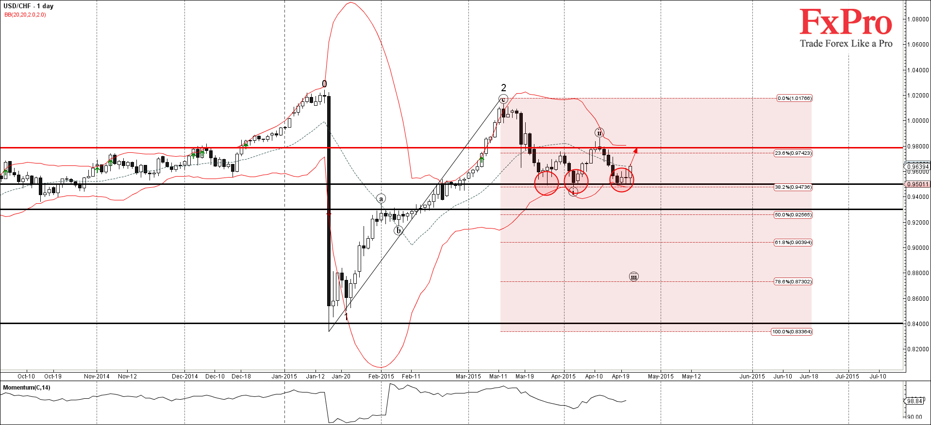 Зона поддержки возле уровня поддержки 0.9500 была усилена нижней дневной полосой Боллинджера и уровнем 38.2% коррекции Фибоначчи предыдущей краткосрочной ABC коррекции 2 от января.