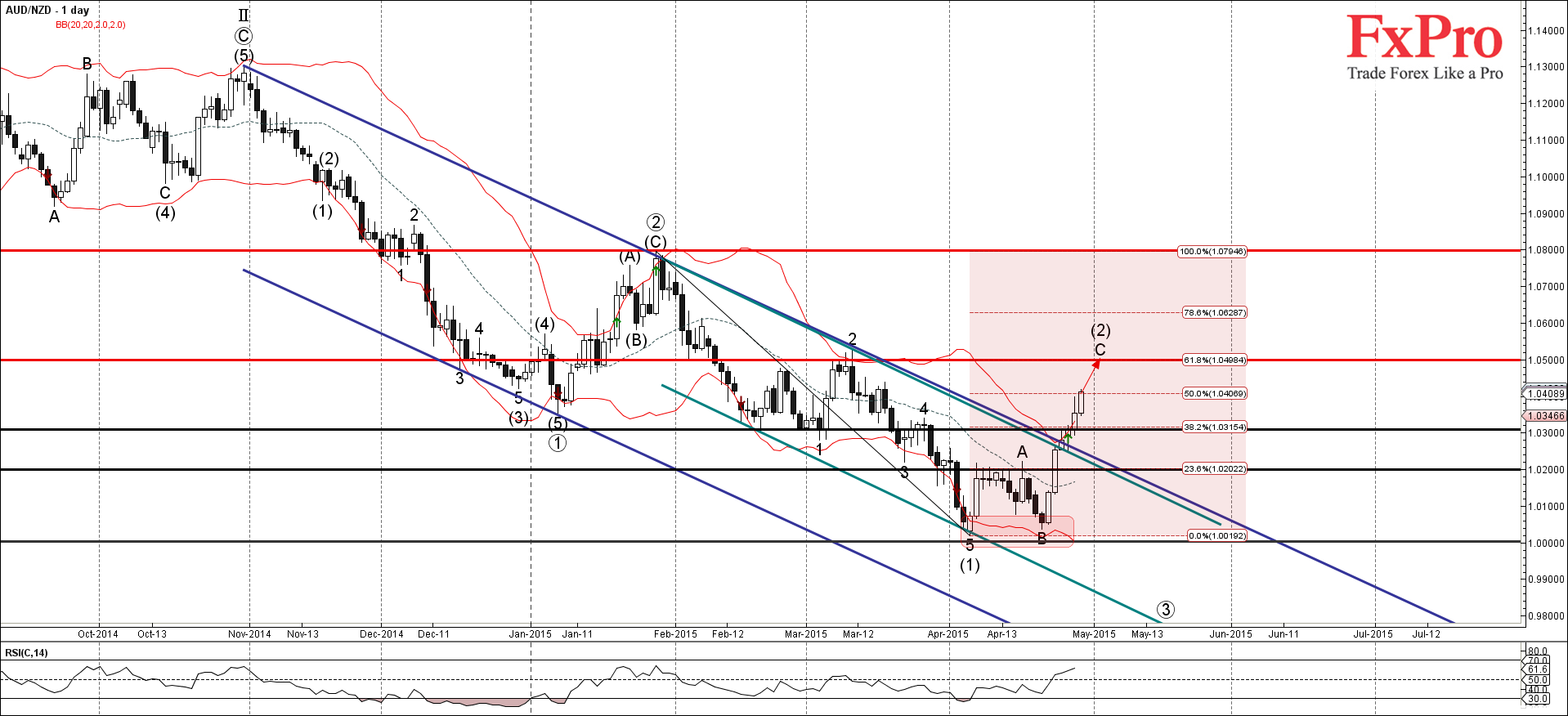 AUD/NZD, скорее всего, продолжит расти внутри активной C-волны к следующей цели для покупок 1.0500 (сильный уровень сопротивления, который развернул волну 2 в марте и прогнозируемая цена для завершения волны С).