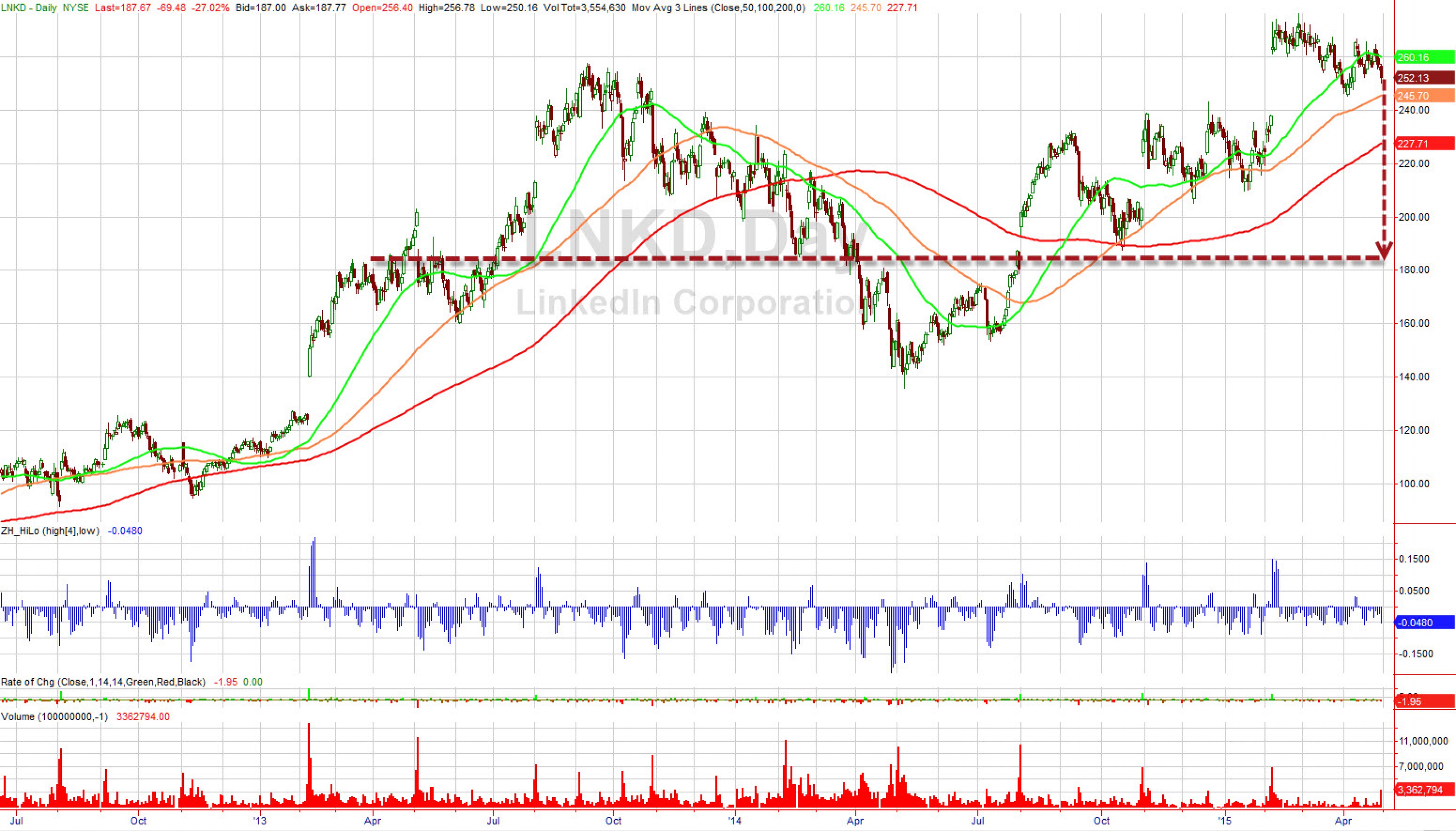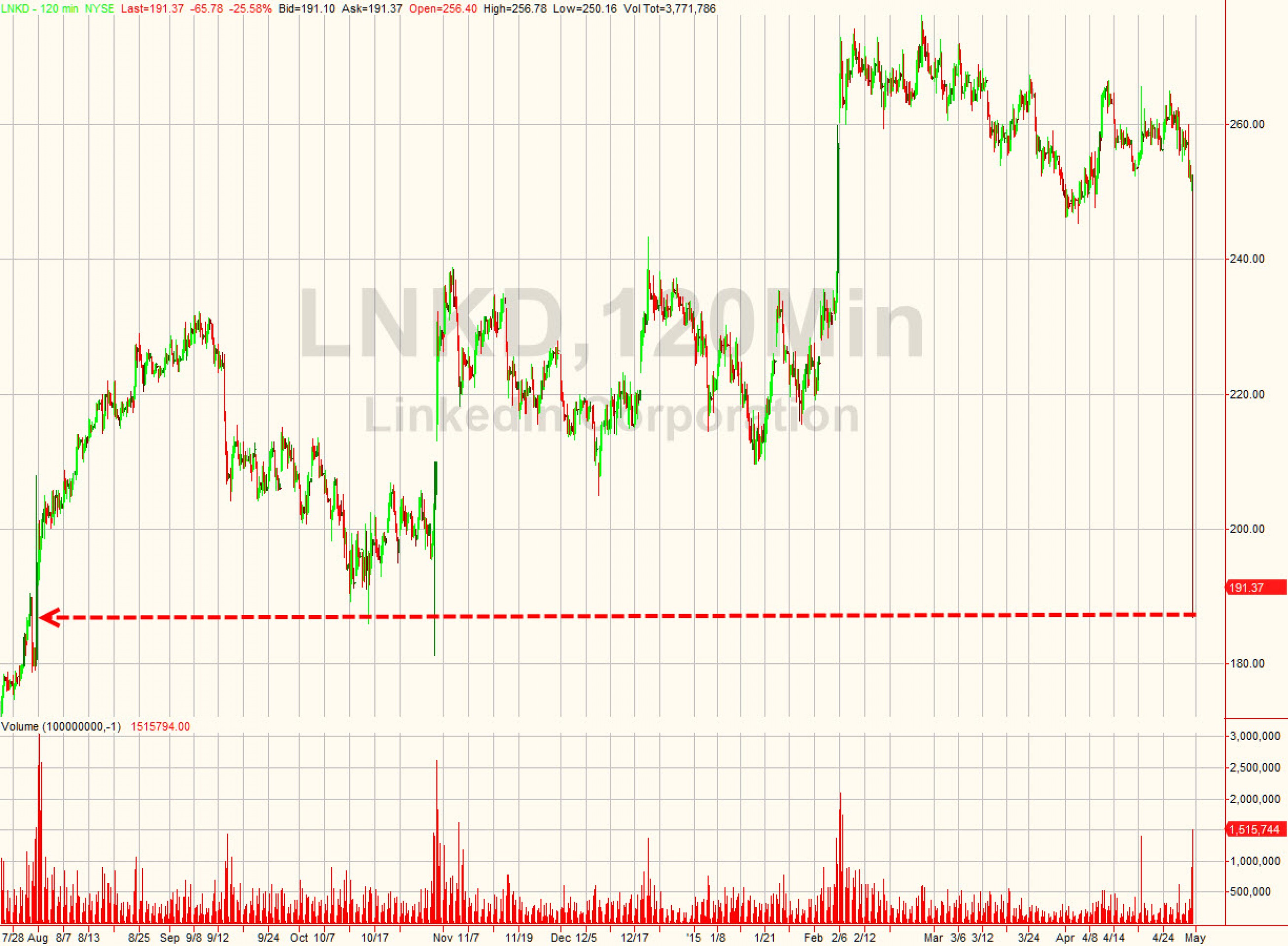 На этом фоне на вечерней сессии акции компании рухнули на 25%. Это падение стало одним из самых сильных за последнее время и сразу же заставило вспомнить подобные случаи с Yelp и Twitter. Главный вывод: корпоративные прибыли, мягко говоря, завышены. Теперь, если посмотреть на динамику акций LinkedIn за два года, видно, что долгосрочные инвесторы не заработали ровным счетом ничего.