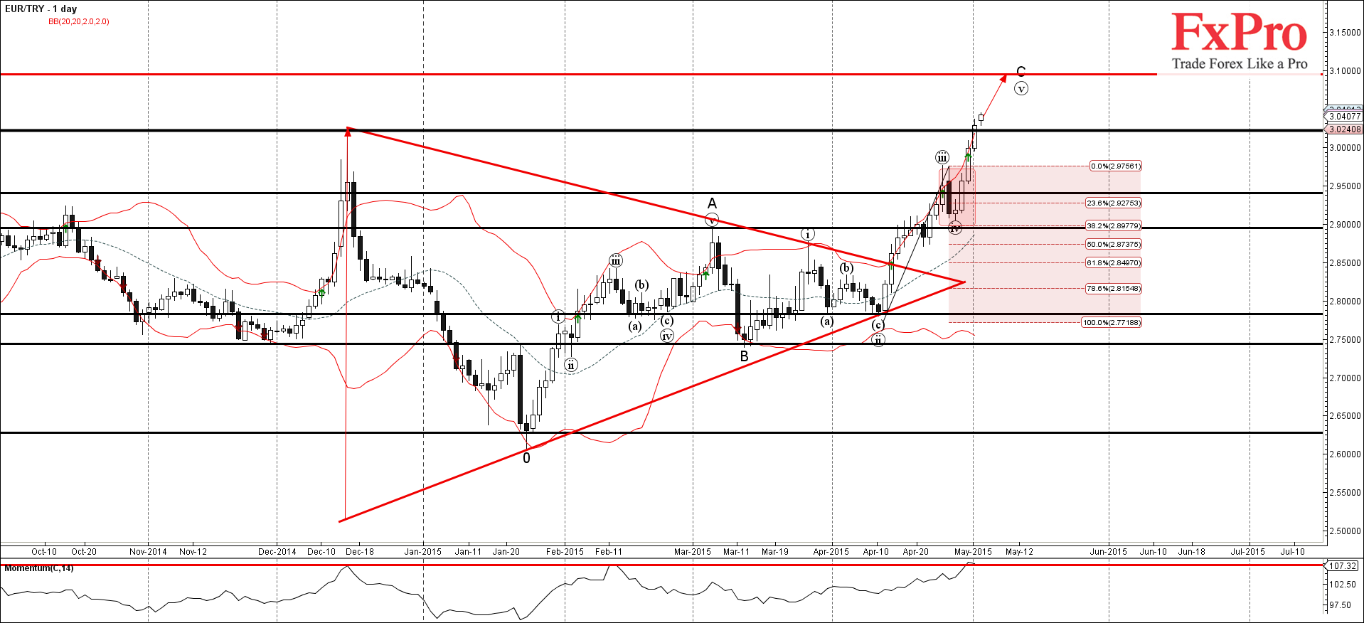 EUR/TRY резко растет в последние 2 недели - в соответствии с нашим предыдущим прогнозом для данной валютной пары. Цена недавно прорвала уровень сопротивления 2.9400 (который был установлен ранее в качестве цели для покупок этого инструмента).