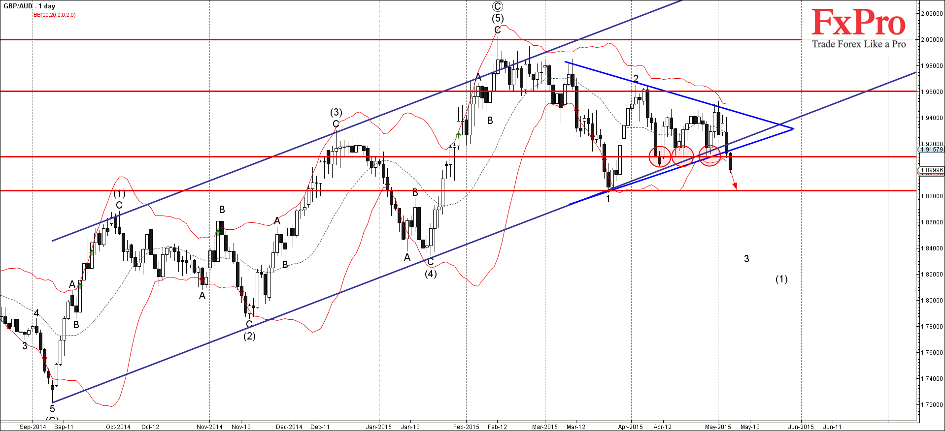 GBP/AUD продолжает падение после недавнего прорыва сильного уровня поддержки 1.9100 (который несколько раз развернул эту пару в апреле, как Вы можете видеть ниже).