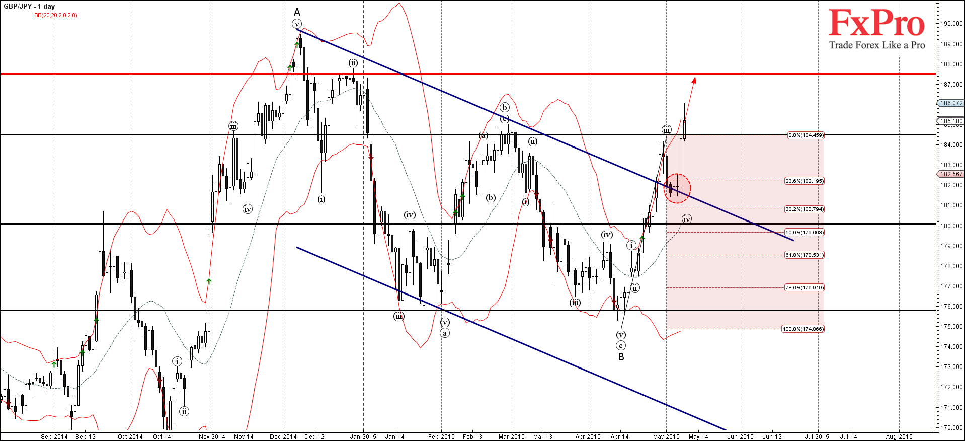 GBP/JPY резко растет в последние несколько торговых сессий - прорвав сильный уровень сопротивления 184.50 (который развернул предыдущую краткосрочную коррекционную волну (b) в конце февраля, как Вы можете видеть ниже).