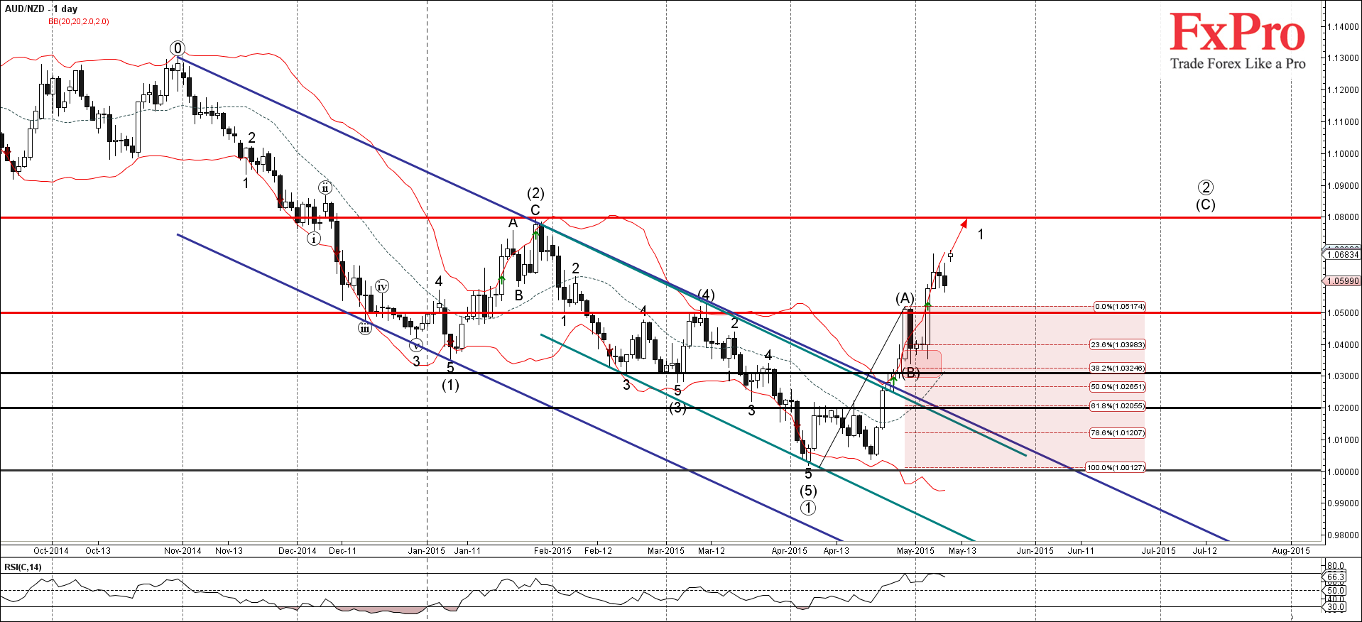 AUD/NZD, скорее всего, продолжит расти внутри активной коррекционной волны (C) к следующей цели для покупок 1.0800 (вершина волны (2) от января и прогнозируемая цена для завершения (С)-волны).