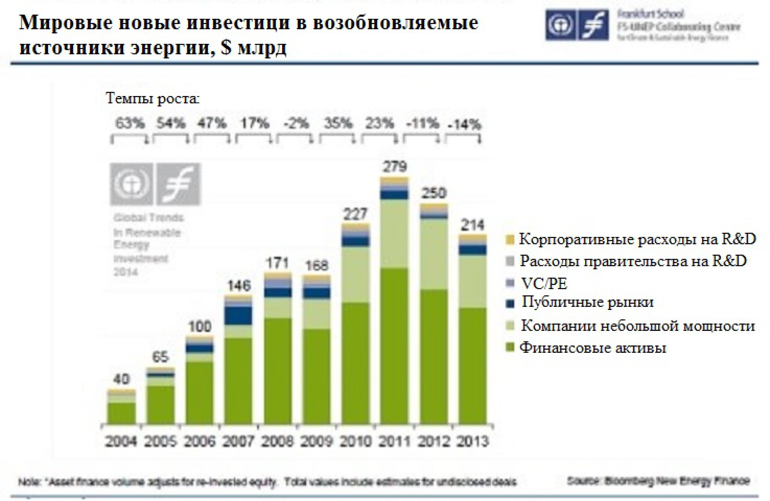 По данным ООН и Bloomberg New Energy Finance, суммарные глобальные инвестиции в возобновляемые источники энергии снизились на $14 млрд до $214 млрд в 2013 г. Одной из причин сокращения стало снижение инвестиций со стороны крупных нефтяных компаний, таких как BP, Chevron и Conoco Phillips.