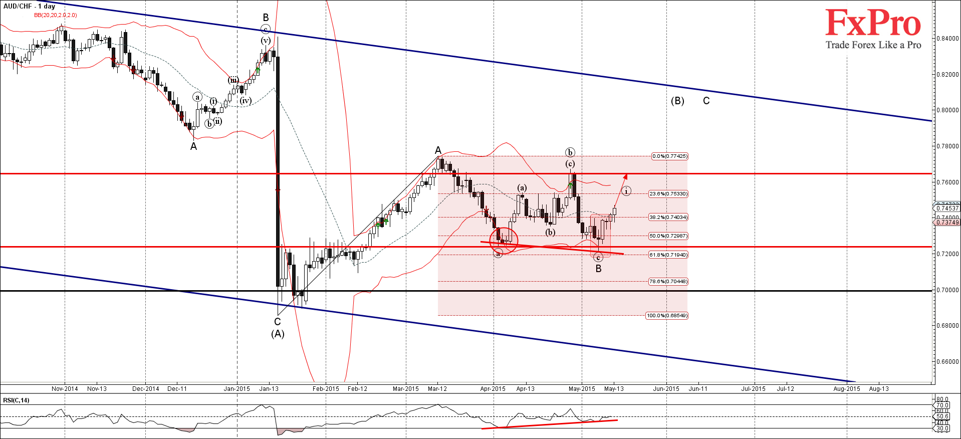 Учитывая ясное бычье расхождение, которое можно видеть на дневном индикаторе RSI, AUD/CHF, скорее всего, продолжит расти к следующей цели для покупок 0.7650 (вершина предыдущей (в)-волны).